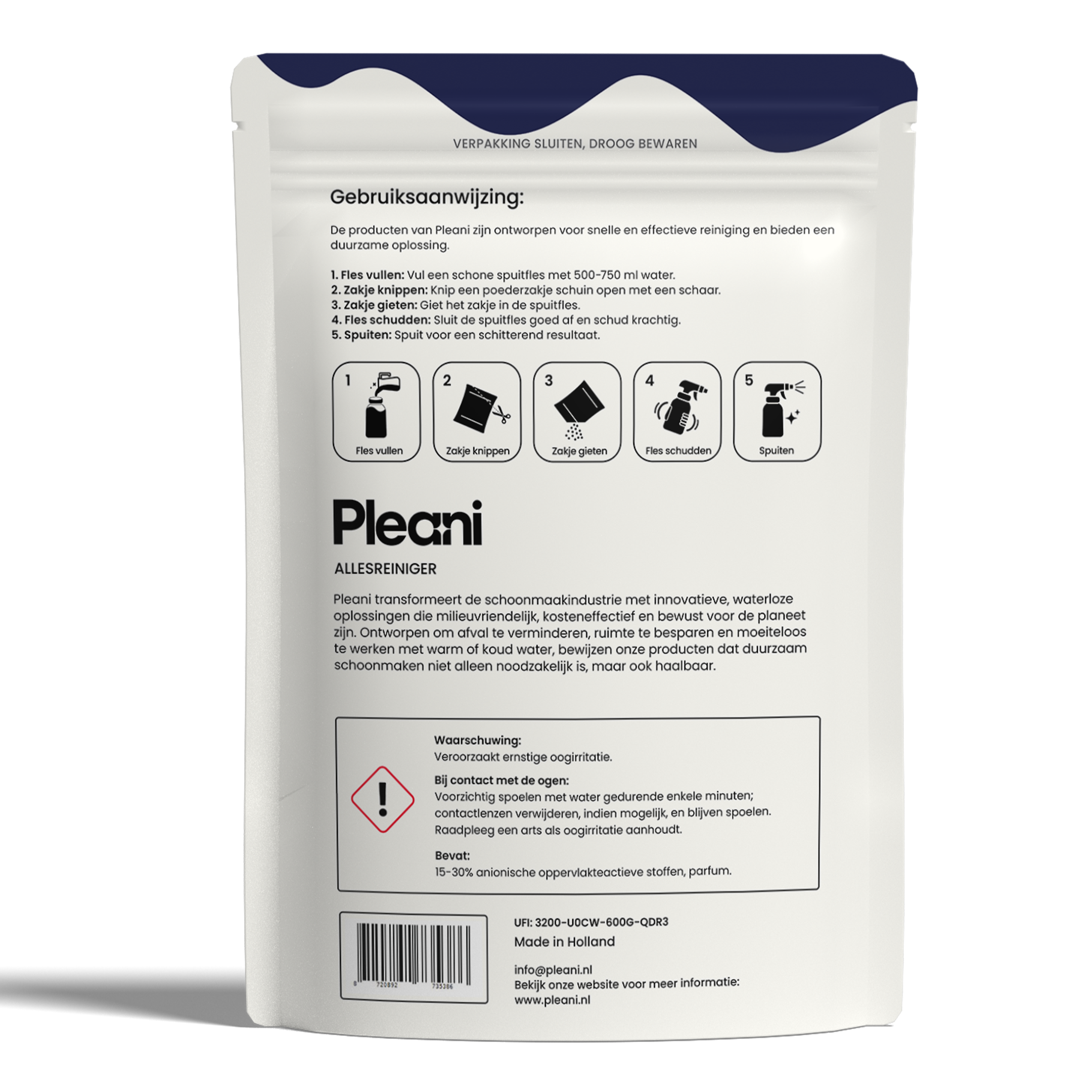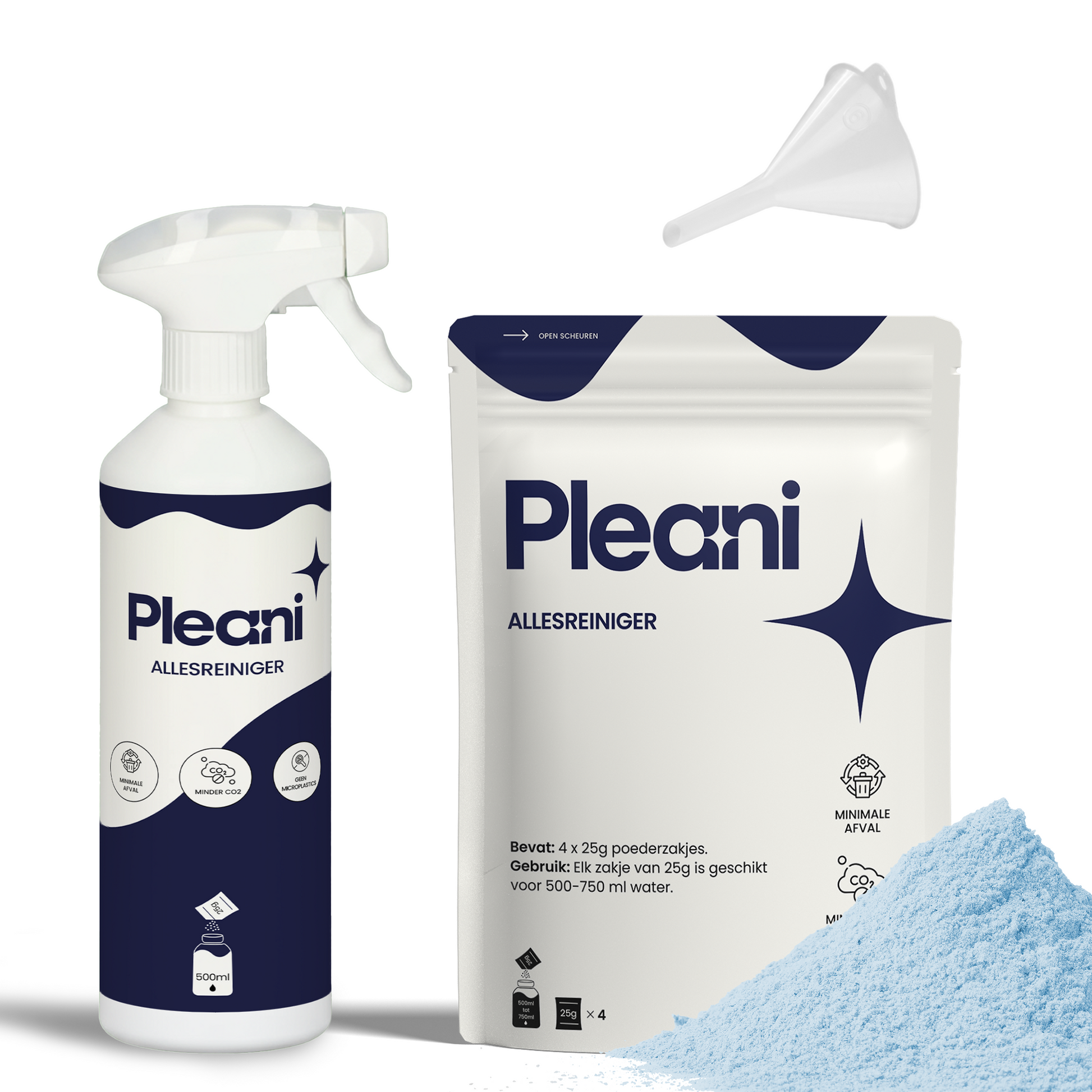 Pleani maakt het schoonmaken toekomstbestendig. Wat als schoonmaakmiddelen geen afvalprobleem zouden zijn, maar juist een deel van de oplossing? Met onze poedervormige navullingen bespaar je ruimte, afval en geld. Je hergebruikt de fles, voegt poeder en water toe - zonder overbodige toevoegingen, met focus op gemak en impact, gemaakt in Nederland.